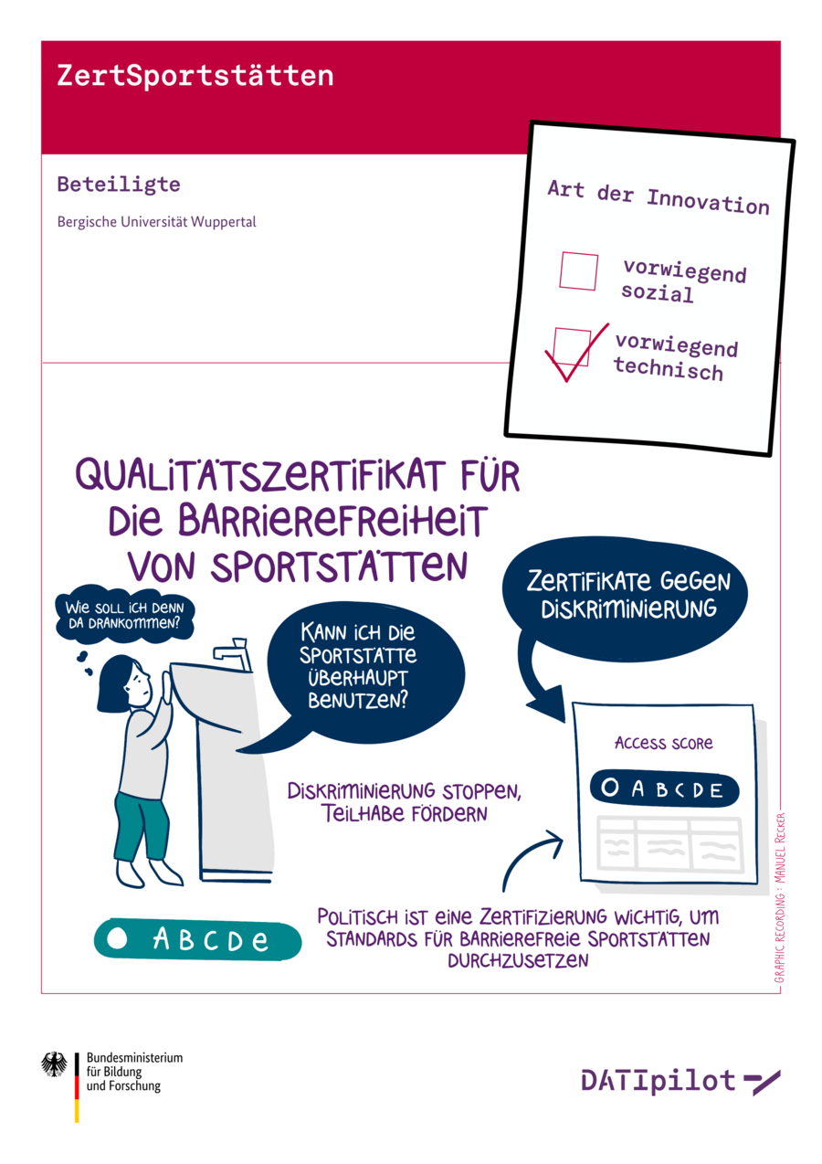 Das Gesamtziel des Vorhabens ist die Entwicklung eines Zertifikationsprogramms zur räumlichen Barrierefreiheit von Sportstätten und eine Prüfung durch die Deutsche Akkreditierungsstelle (DakkS).